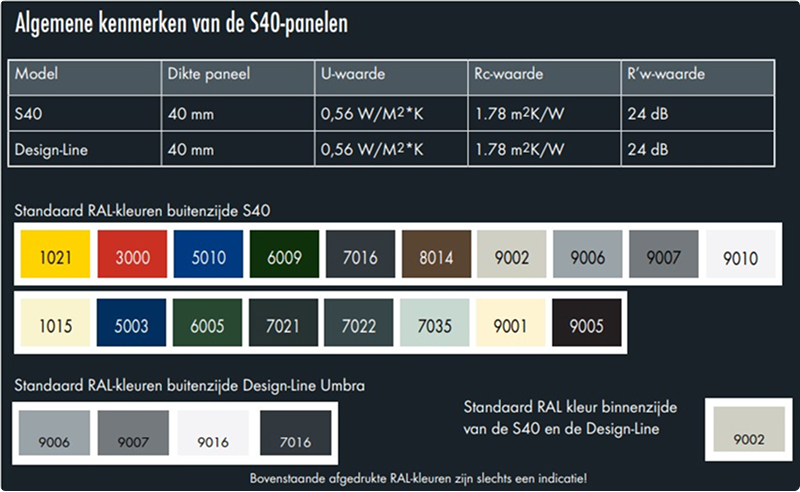Het standaard Pro-Line S40 model heeft aan de buitenzijde een stucco oppervlak met horizontale belijning, wat zorgt voor een functionele en representatieve uitstraling. De panelen zijn leverbaar in diverse standaard kleuren en kunnen tegen meerprijs worden uitgevoerd in iedere gewenste RAL-kleur. De binnenzijde van de poort is eveneens voorzien van stucco met horizontale belijning en is standaard afgewerkt in RAL 9002.