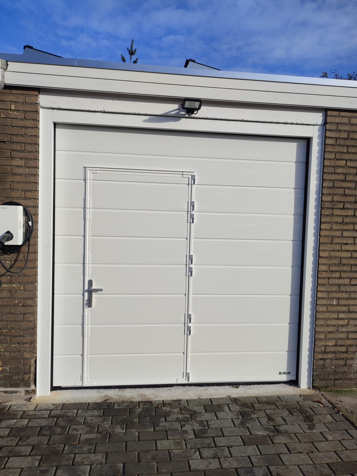 De klant wilde van de garage een werkruimte maken die in de winter goed afsluitbaar is. Een sectionale garagepoort met loopdeur bleek hiervoor de juiste oplossing. Om extra ruimte te creëren is een 3-zijdig montageprofiel toegepast, waardoor de garagepoort circa 20 cm naar voren is geplaatst. De garagepoort zelf wordt nauwelijks gebruikt, maar de loopdeur heeft zich in de praktijk als een waardevolle investering bewezen.